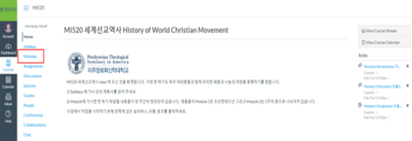 Basics of studying using Canvas… Use the “Modules” in the left Menu bar and follow the instructions. Other sections like "Assignment", "Discussions", "Quizzes" will not be needed when studying. You can think of them as “storage” for the Modules. Everything you need to communicate with the professor is in the Modules. You can go into the Modules to watch lectures, join discussions, and submit assignments.